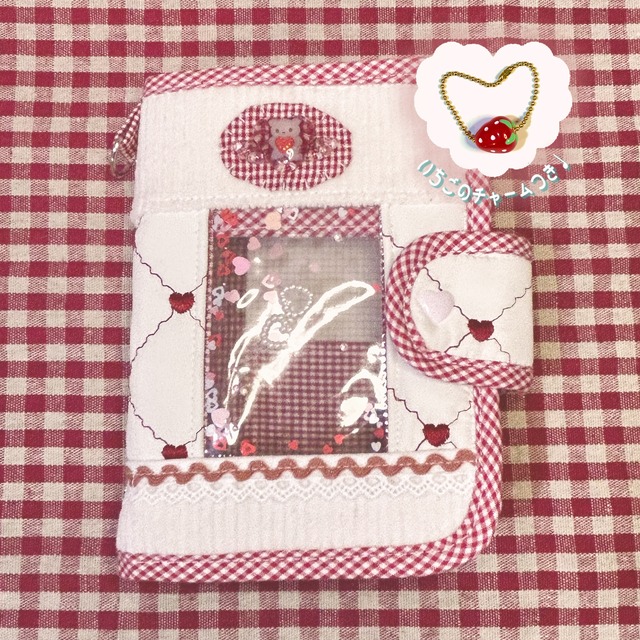 A7サイズのお手製バインダー♥ バレンタインをイメージした限定カラーです。いちごのチャーム付き! 手帳やシール帳、コレクションポーチなど、使い方に合わせてお好きにカスタムできます! ✰✮おすすめポイント✮✰ ✶表紙にはひとつひとつ手作りの天使ハートクマのマスコットがついています ✶表紙の透明窓には名刺サイズ(約91mm×55mm)のトレカやシールなどを挟めます ✶背表紙にはストラップをつけられる金具がついています (別売りのクマ邂逅アクキーもつけられるよ!) 【サイズ】 閉じた状態:約16.5cm×12cm 開いた状態:約16.5cm×25.5cm バインダー金具:A7サイズ6穴/穴間隔2cm ┈┈┈┈┈┈┈┈┈┈ ⚠︎︎ご注意⚠︎︎ ・ハンドメイド品のため、お取り扱いにはご注意ください。 ・マスコットの天使ハートクマはひとつひとつ手作りのため、写真と印象が異なる場合がございます。あらかじめご了承ください。 ・透明窓部分のフレークやビーズは目測で封入しているため、写真と印象が異なる場合がございます。また、布の柄の出方にも個体差がございます。 ・金具部分で怪我をしないようお気をつけください。