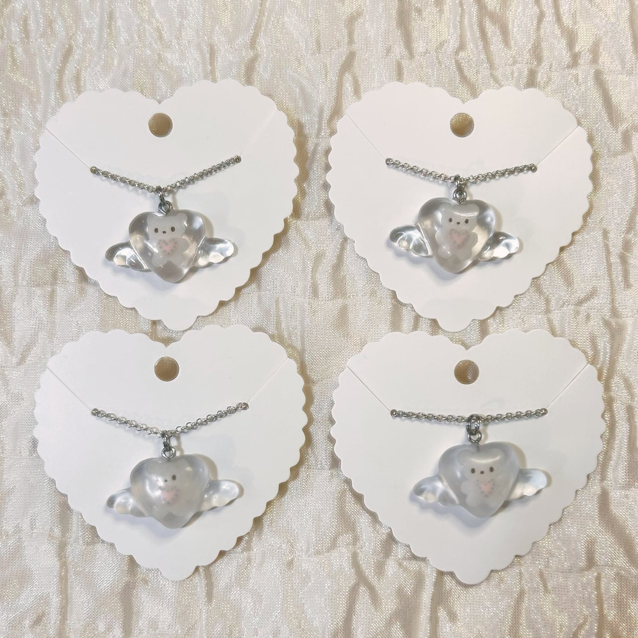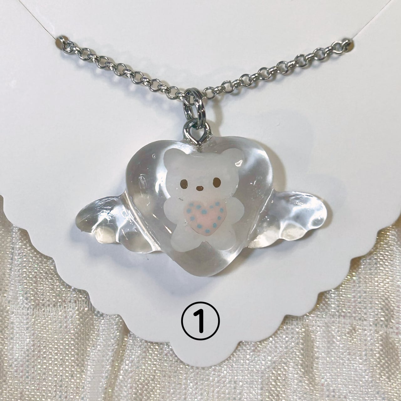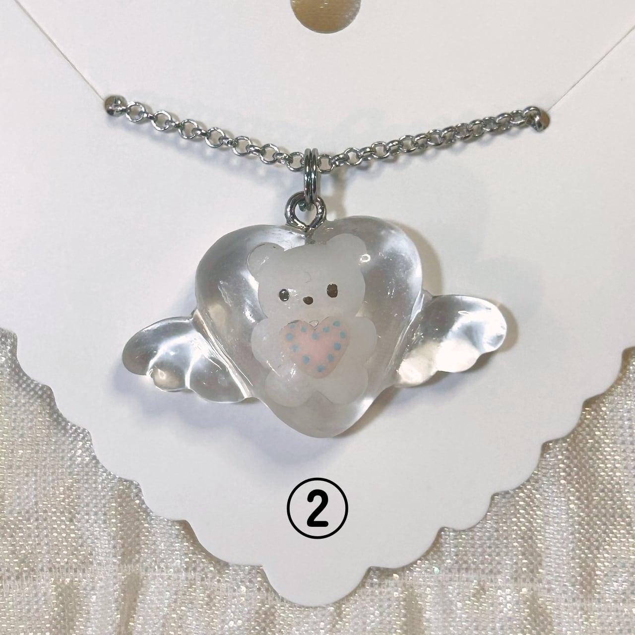 クマが閉じ込められた天使ハートのペンダントです。レジン製で、クマたちも一つ一つ手でこねてペイントしています。